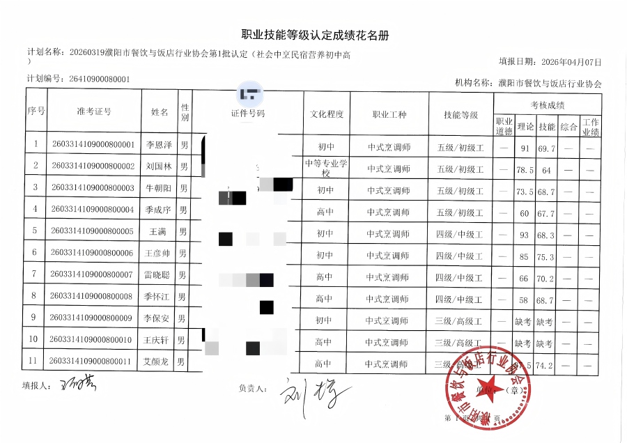濮阳市餐饮与饭店行业协会 职业技能等级认定 2026 年第 1 批结果公示